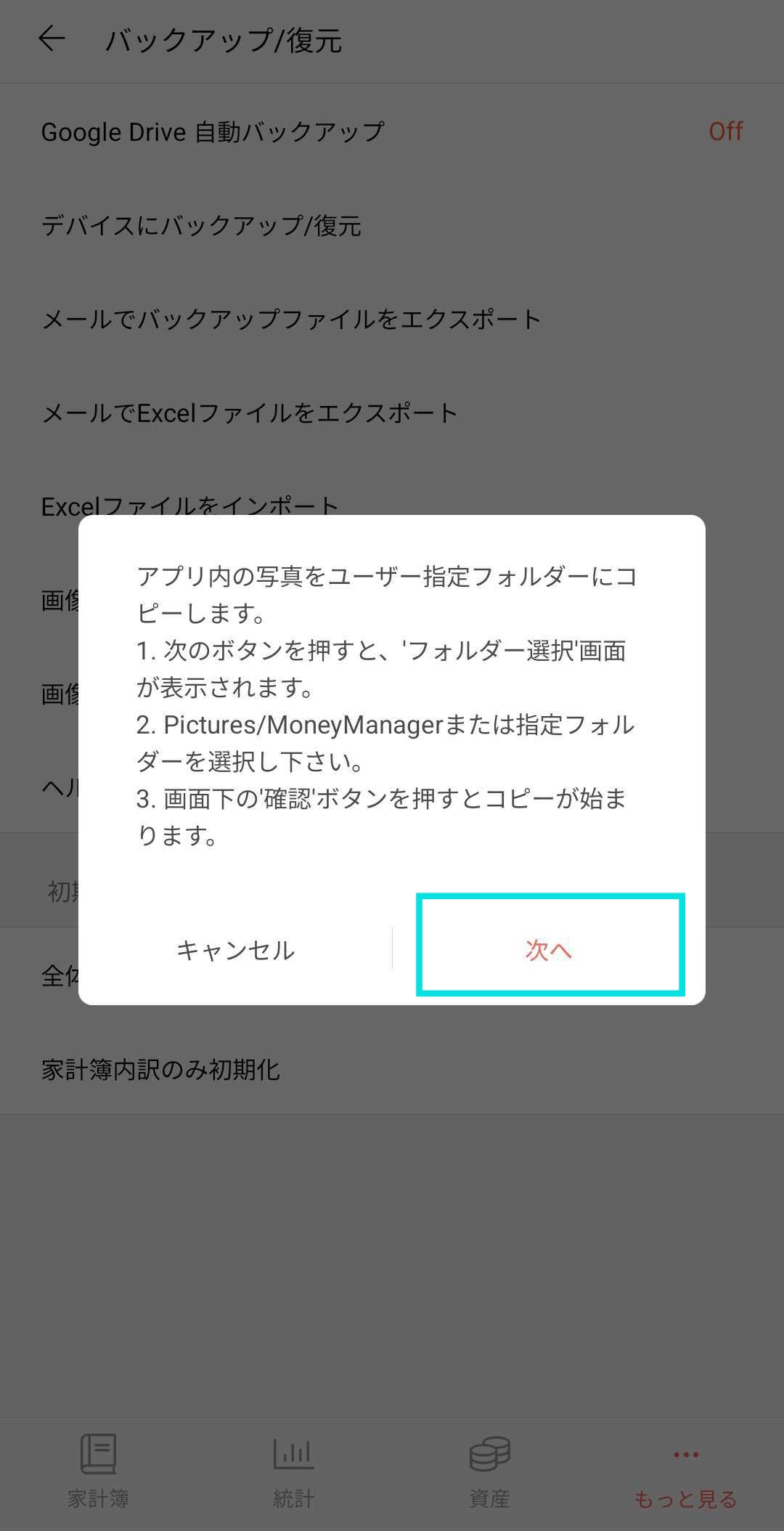 3)ポップアップ画面が表示されたら「次へ」を押し、写真データを保存するフォルダーを選択します。Pictures/MoneyManager又は指定フォルダーを選択します。